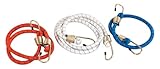 MIT 3-PC. HEAVY DUTY BUNGEE CORD SET features: Heavy Duty 12mm Elastic Strap Provides Constant Tension and a Firm Hold, Brass Plated Spring Steel Hooks and Woven Polyester Strap Cover, Perfect for Tarps, Cars, Trucks, Trailers, etc. 1-pc. 24" Bungee Strap (Blue), 1-pc. 36" Bungee Strap (Red), 1-pc. 48" Bungee Strap (White) Heavy Duty 1/2-Inch Diameter Elastic Strap Provides Constant Tension to Keep Cargo in Place Weather-Resistant Brass Plated Spring Steel Hooks and Woven Polyester Strap Cover Quickly Secures Tarps and Light Cargo on Trucks, Trailers, Vans, and SUVs 1 piece each of 24 in, 36 in, and 48 in Sizes Quality Guarantee