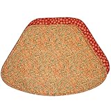 Measures approximately 13 inches deep, 9 inches wide at the top and 20 inches at the bottom. 100% Cotton outer, with 100% Polyester fill. Machine Washable. Reversible design. The wedge-shaped placemat is designed especially for round tables! No more overlapping mat or having corners hang over the edge.