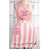 Will Cook for Shoes" is embroidered in black on a light pink background of the upper half of apron along with an image of a shoe; the bottom half features pink and white stripes with a pink pocket bearing an image of a shoe "Lots and Lots of Shoes!" is embroidered along the bottom of the apron along with an image of a shoe.